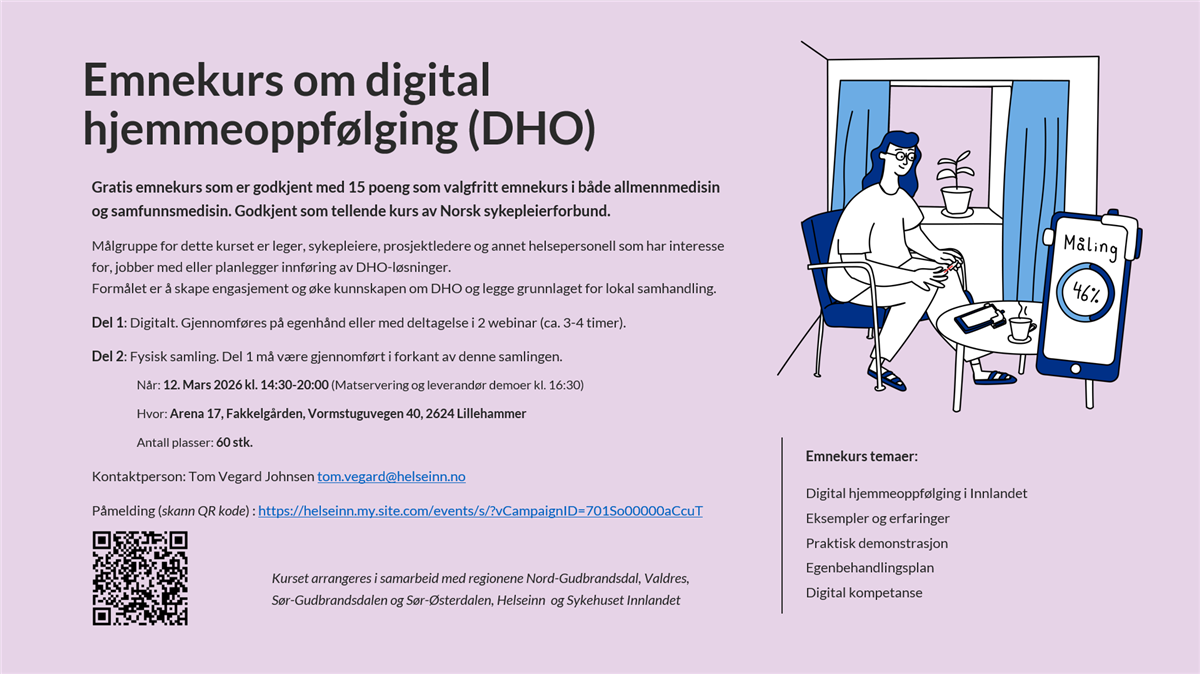 Link for mer informasjon og påmelding: https://helseinn.no/helseinn-event/emnekurs-digital-hjemmeoppfolging-dho/