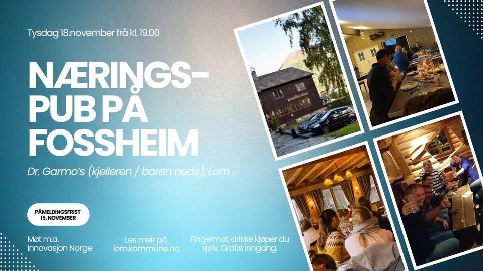 Næringspub på Fossheim 18. november Den 18. november inviterer vi til ein næringspub i Lom der vi presenterer nokre av dei "gode hjelparane" for bedriften i Ottadalen, i tillegg til at d... Publisert 14.11.2025 kl. 16.26